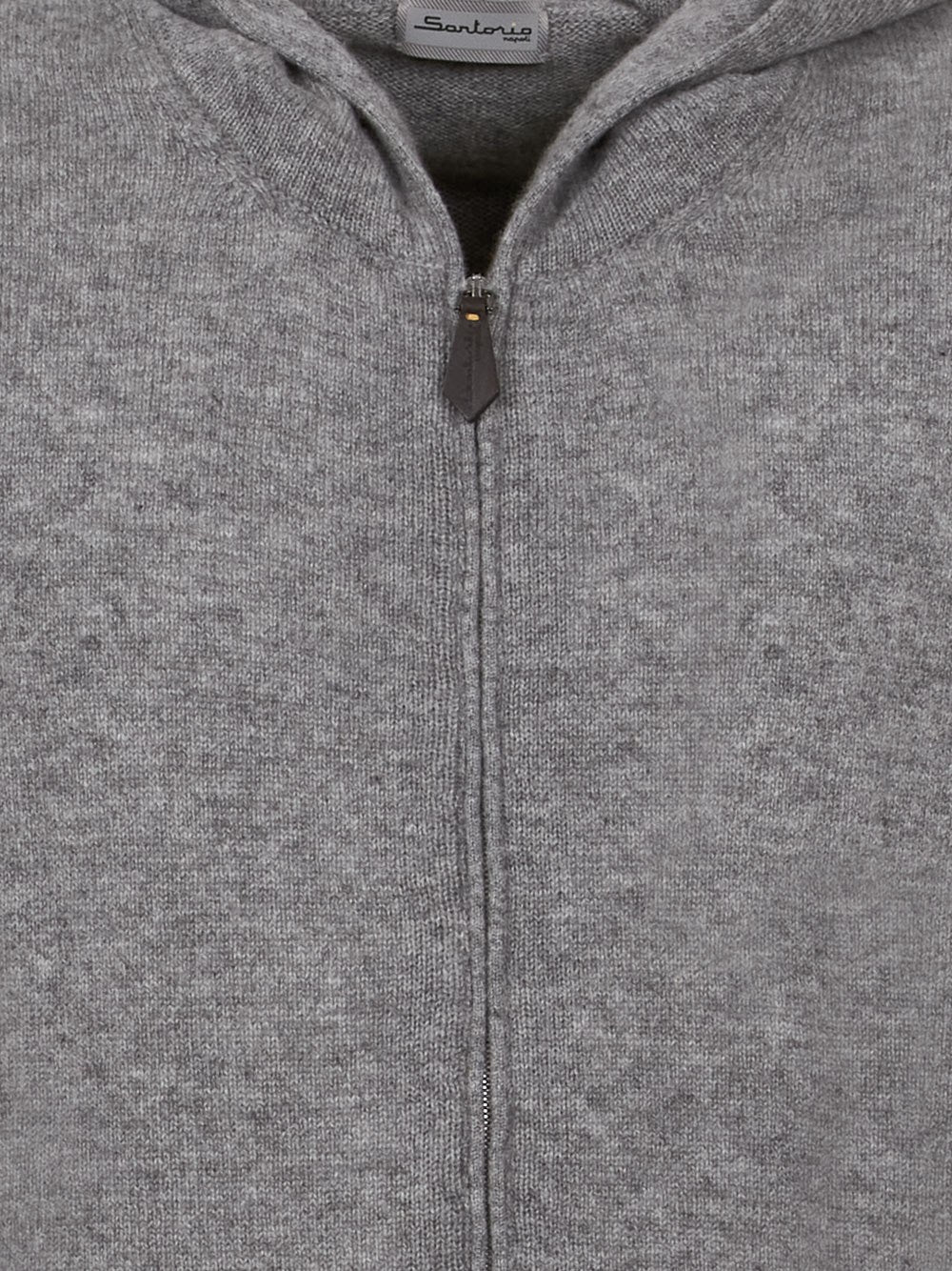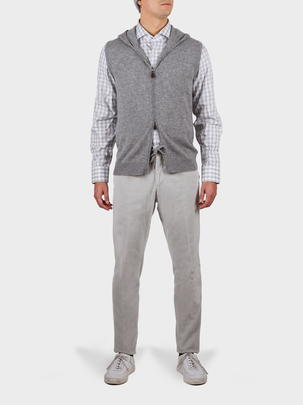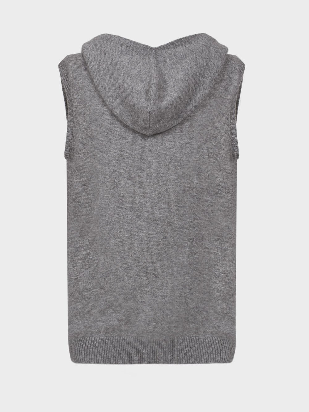 - 100% кашемир - Застежка на молнию - Свитер без рукавов с капюшоном - Серый цвет - Полностью изготовлен в Италии Рост модели 1,86 см, размер M